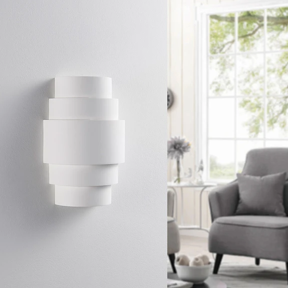 Marit vägglampa i gips med trappstegsliknande utseende Marit är en verkligt förtrollande ljuskälla för vardagsrummet. Ljuseffekten är verkligen magnifik och skapar ett vackert samspel mellan ljus och skugga. Detta beror på skärmens trappstegsformade design, som gör att ljuset kan komma ut på olika ställen.