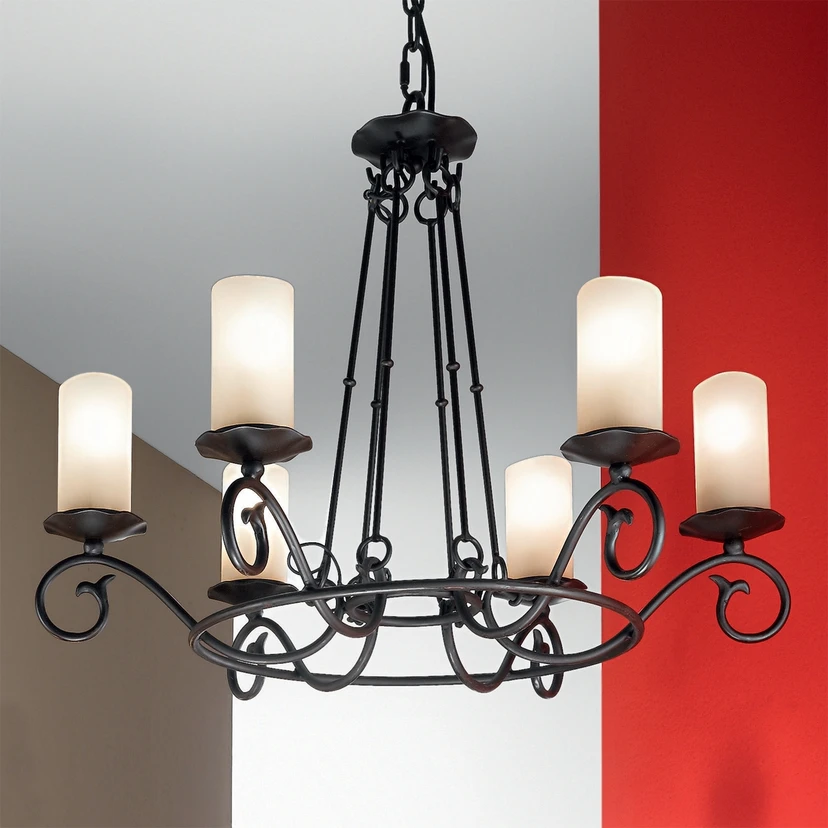 BENTE ljuskrona med arkaisk charmMed BENTE ljuskrona kommer en sagolik, medeltida atmosfär in i hemmet. Med sin smidda metallram och de krämfärgade, ljusformade glascylindrarna ser den ut som om den kommer från en tid då riddare höll sina middagsrundor, men är naturligtvis utrustad med modern ljusteknik.