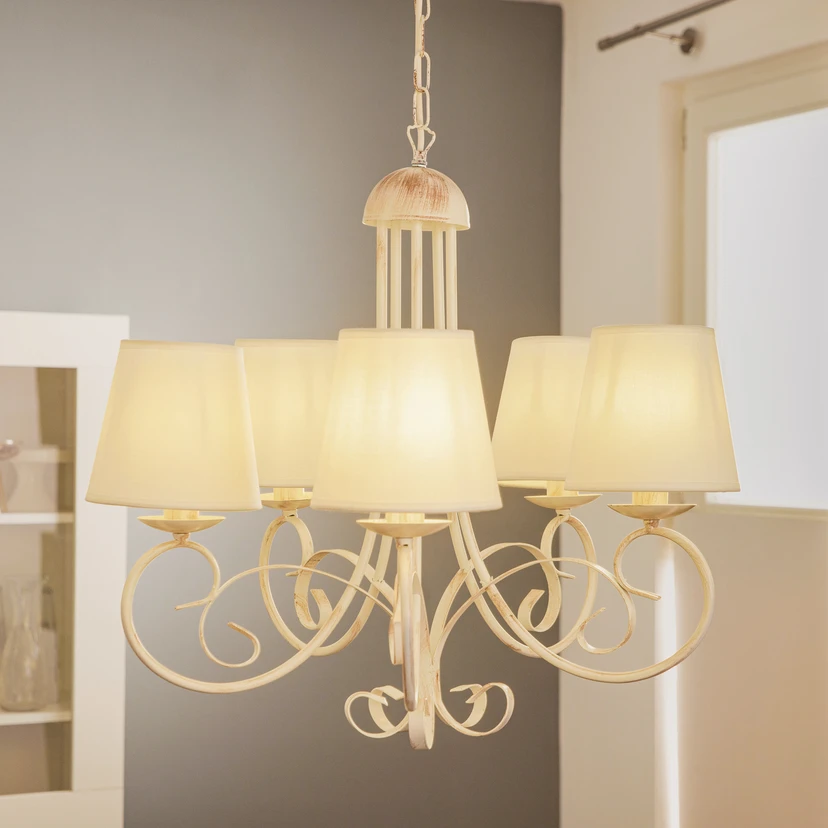 Ljuskronan Pompei förenar rustik charm med tidlös elegans och blir ett blickfång i varje vardagsrum eller matsal. Den är tillverkad av högkvalitativt järn och förädlad med textilskärmar och lyser i en tilltalande antikvit. Kombinationen av material och färger ger rummet en varm och inbjudande atmosfär som kompletterar både traditionella och moderna inredningsstilar.