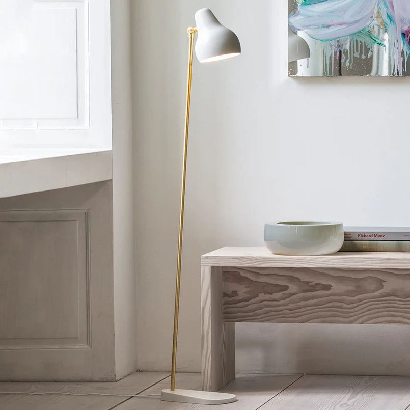 Klassisk golvlampa av Vilhelm Lauritzen: Modell VL38 nu med LED Bland de mest kända verken av den danska arkitekten Vilhelm Lauritzen (1894-1984) finns det danska sändningscentret "Radiohuset" i Köpenhamn och den första flygplatsen i den danska huvudstaden. När det gäller belysning är han mest känd för VL38-modellen som är uppkallad efter honom, som han designade i slutet av 1930-talet för samma "Radiohuset". Den danska belysningstillverkaren Louis Poulsen tog då med modellen i sin katalog, och idag upplever denna klassiker en revival. Den har utrustats med LED-teknik, vilket gör den till en modern belysningslösning med en populär retrolook. Golvlampans huvud och stativrör kan vinklas något och anpassas till användarens behov. Ljusstyrkan kan ställas in på två nivåer (50 och 100 %) - inklusive minnesfunktion. En annan praktisk funktion hos VL38 LED-golvlampan är timern, som stänger av lampan automatiskt efter fyra eller åtta timmar. Obs: Golvlampans mässingsdelar är obehandlade och kan därför utveckla en patina med tiden.
