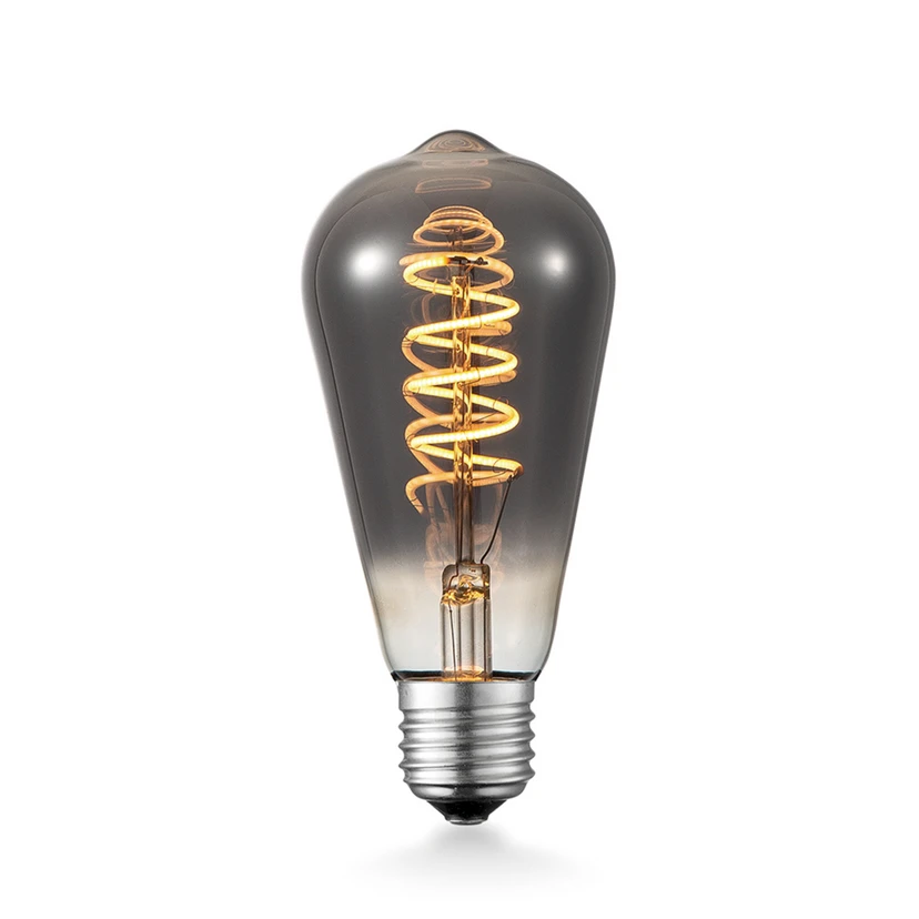 E27 ST64 LED-lampa 4W med varmvit ljus i rustik form Det speciella med den är också glasfärgen i titan, som ger ett markant och exklusivt intryck. Glödtråden inuti lampan sticker ut med sitt särskilt varmvita ljus, vilket ger en vacker kontrast. Denna intressanta lampa kommer bäst till sin rätt i öppna och skärmfria armaturer och har en utmärkt färgåtergivning (CRI >; 90)
