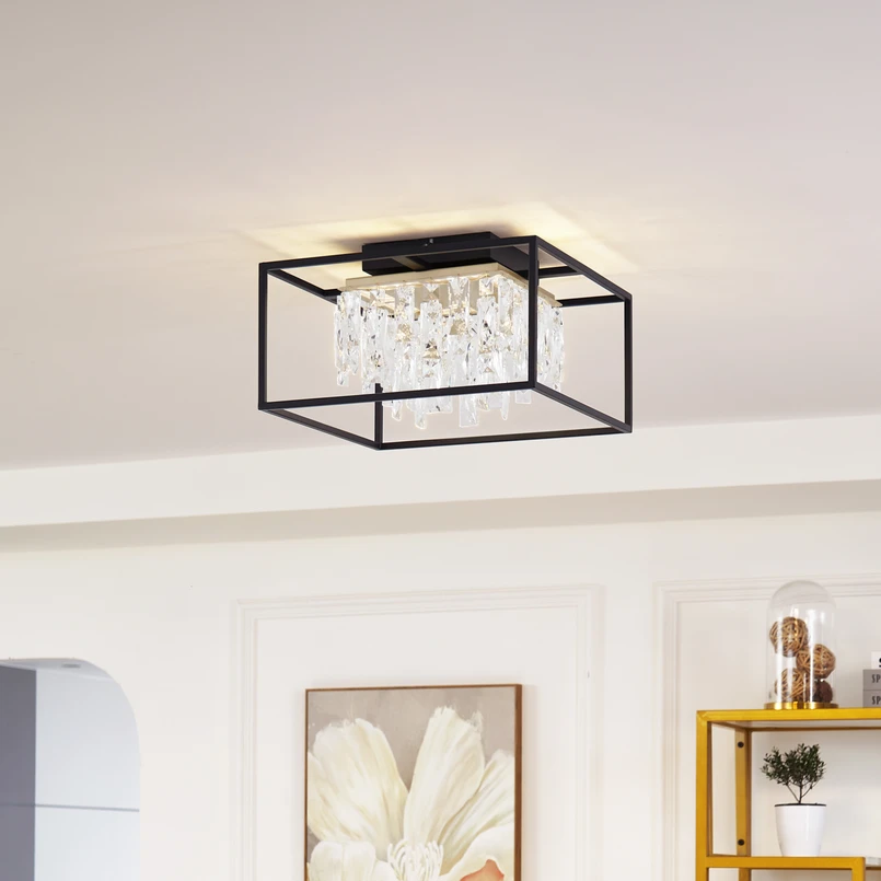 Dimbar LED-taklampa Kassi i kristall-look Den kantiga LED-taklampan Kassi imponerar med sin eleganta färgkombination av guld, svart och de klara, skimrande plastkristallerna, som är omgivna av en diskret ram. Detta ger taklampan en unik atmosfär i alla vardagsrum. Med en färgtemperatur på 3.000 K ger den ett behagligt och mysigt ljus. Den integrerade LED-ljuskällan har inte bara lång livslängd utan är också energieffektiv, och ljusstyrkan kan justeras i tre steg med en vanlig väggbrytare för att alltid skapa rätt ljus. Den eleganta kristallskärmen ger lampan en touch av elegans och gör den till ett blickfång i alla rum. Inte minst skapar de reflekterande egenskaperna en spännande ljusupplevelse.