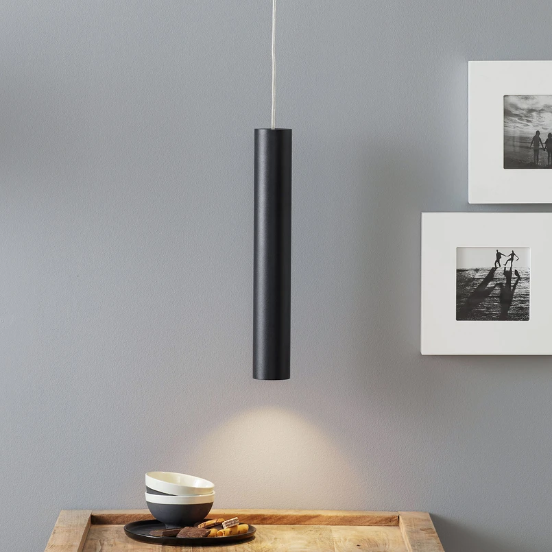 Enkel pendellampa Luana imponerar med sina klara linjer Enkel och elegant, det är pendellampan Luana. Den långa, cylindriska lampskärmen är tillverkad av stål och fäst vid en diskret upphängning. Armaturen drar inte till sig någon större uppmärksamhet, utan fokuserar istället på de objekt som ska belysas. Ljuset avges vertikalt nedåt så att objekten belyses med exakt precision. Luana kan användas i en butik för att skapa en scen för produkter eller för att framhäva speciella element.