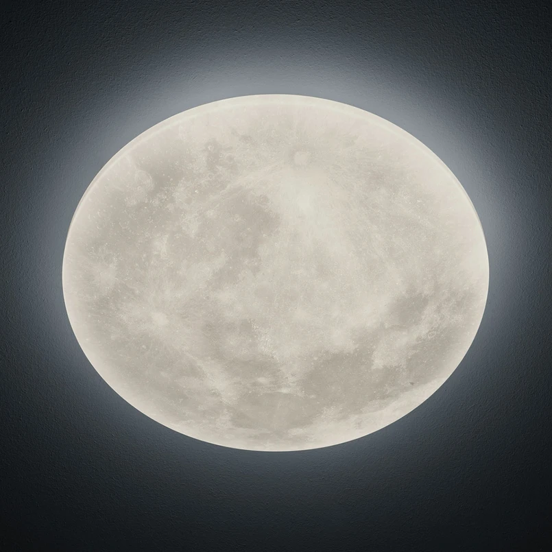Lunar LED-taklampa - en lampa med månen som förebild LED-taklampan Lunar har utformats så att den är lika rund som fullmånen och har dessutom en ytdesign som påminner om månlandskapet. Den levereras med en infraröd fjärrkontroll som kan användas för att bekvämt och flexibelt styra ljuset från de integrerade, varmvita lysdioderna. Olika månfaser kan väljas via fjärrkontrollen (ljus från ena sidan av armaturen till den andra, cyklisk omvandling - gradvis ljusare, gradvis dämpning av ljuset, ljuset kan justeras i ljusstyrka, inställt på nattljusläge eller 100% ljusstyrka). När Lunar LED-taklampan är påslagen via väggströmbrytaren, lyser den med 100% ljusstyrka. Flera Lunar-lampor kan också styras med en fjärrkontroll.