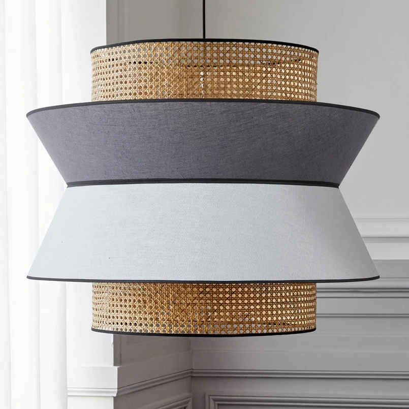 Hänglampa Singapour XXL för stora rum Med sin iögonfallande design med tre skärmar och sin storlek är hänglampan Singapour XXL idealisk för att belysa större bord och ytor. Dess utseende har en naturlig effekt och passar många moderna inredningsstilar. Under tygskärmen av tvättat linne, som består av två delar i olika färger, sitter en annan skärm i konisk form, som är tillverkad av rottingflätning. När ljuset faller in syns denna skärm tydligt under linneskärmen, eftersom rottingmönstret är synligt under tyget. Resultatet är en ljusfylld atmosfär med en speciell karaktär som skapar en mysig atmosfär. Utrustad med textilkabel - externt dimbar Designen av lampserien Singapour kommer från MARKET SET, ett ungt designteam från belysningsföretaget Corep SAS från Bègles i Frankrike, som skapar prisvärda, lyxiga lampkollektioner.