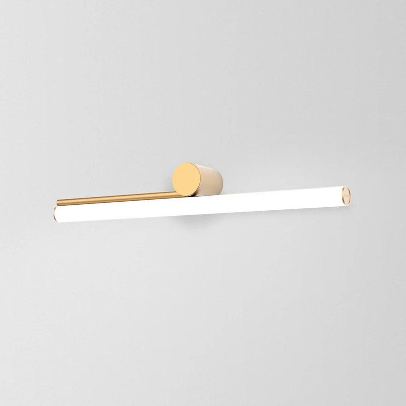 För att utöka portföljen av den här serien skapades olika väggarmaturer som kompletterar den. I den här versionen är Ambrosia fäst på väggen med ett cylindriskt fäste av aluminium och stål. Till vänster sitter stöttan som håller det öppna LED-röret, som också är tillverkat av aluminium. Ljusröret innehåller högkvalitativa SMD-ljusdioder och har ett opalvitt skydd av metakrylat som avger det varmvita ljuset något diffust. Detta skapar en behaglig men samtidigt bra belysning som återspeglar det visuella spelet mellan funktionalitet och estetik i Ambrosias design.