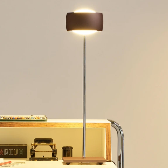 Med intuitiv geststyrning - Grace LED bordslampa Grace LED bordslampa är ett imponerande belysningsobjekt för både moderna och sofistikerade vardagsrum. Hela lampkroppen, som består av en rektangulär basplatta, en graciöst formad lampstav och en linsformad lampskärm, är tillverkad av högkvalitativt aluminium och förfinad med en elegant färgad lack i skärmen och basområdet. Skärmen, som är öppen upptill och nedtill, är utrustad med ett satinerat glasskydd för bländfri belysning, så att det varmvita LED-ljuset flödar ut i omgivningen på ett underbart jämnt och behagligt sätt. Som en speciell egenskap har en sensor installerats i armaturhuvudet, som möjliggör beröringsfri ljusstyrning genom intuitiva gester. Det innebär att ljuset kan dimmas kontinuerligt genom att hålla handen i sensorområdet under en längre tid eller tändas och släckas med en enkel handrörelse. På så sätt kan ljuset när som helst anpassas till situationen, t.ex. för att skapa en mysigare ljusstämning. Minnesfunktionen, som också är integrerad, sparar den senast valda ljusstyrkan så att den kan återskapas när ljuset tänds igen.