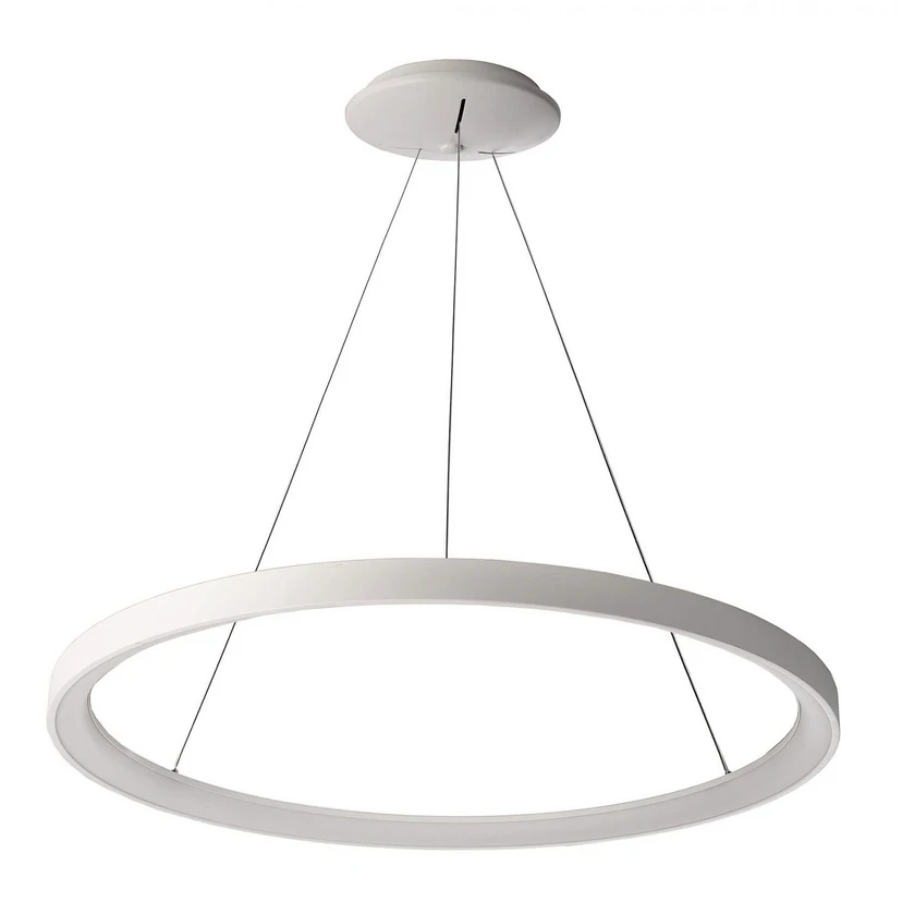 Dimbar Merope cirkulär LED-pendellampa LED-pendellampan Merope har en modern, minimalistisk look. Den består av en rund baldakin på vilken en aluminiumring är fäst, som innehåller kraftfulla lysdioder på insidan. Dessa lyser upp rummet perfekt och ger ett dimbart, varmvitt ljus. Den är idealisk för användning i moderna vardagsrum och för bordsbelysning, till exempel i matsalen eller köket.