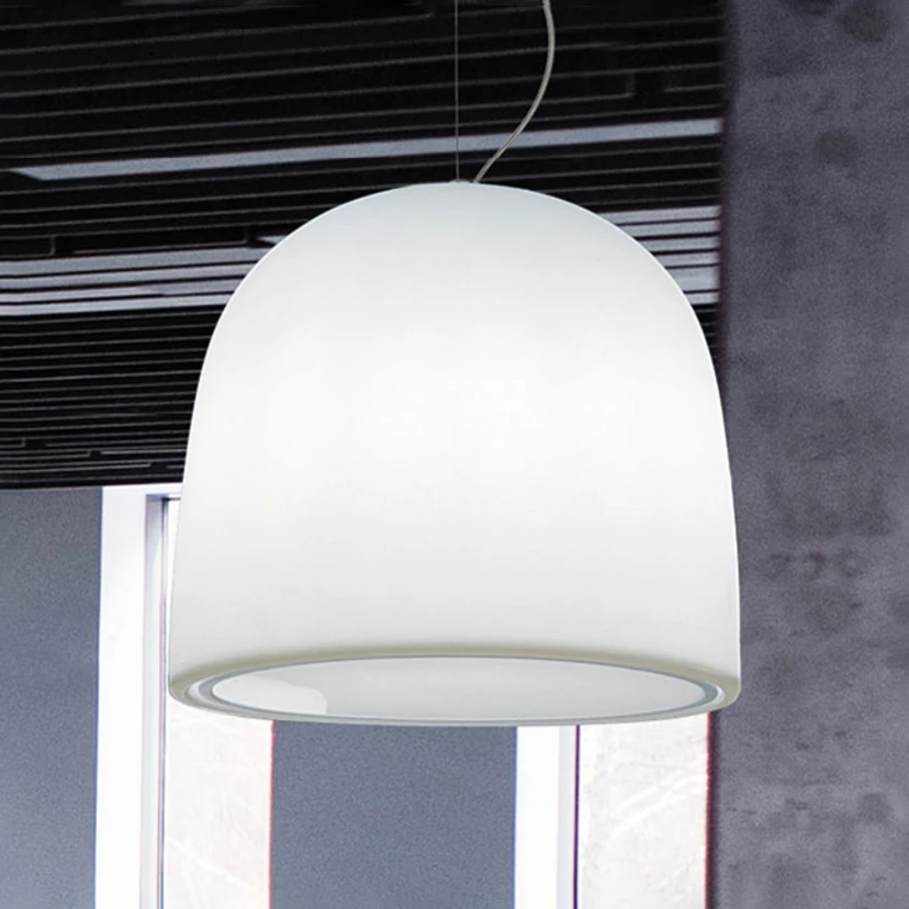 Campanone pendellampa med klockformad skärm Pendellampan Campanone har fått sitt namn efter skärmens form, eftersom Campanone är italienska och betyder "klocka". Den stora polyetenskärmen är försedd med en E27-sockel där alla typer av glödlampor kan användas; matchande lampor finns som tillbehör. Campanone designades 2005 och denna vackra ljuskälla skapades av den italienska designern Paolo Grasselli. Campanone-pendellampan tillverkas av det unga belysningsföretaget Modo Luce från Vazzola i Italien, som använder högkvalitativa material och kreativ design för att ge ljuset dess form.