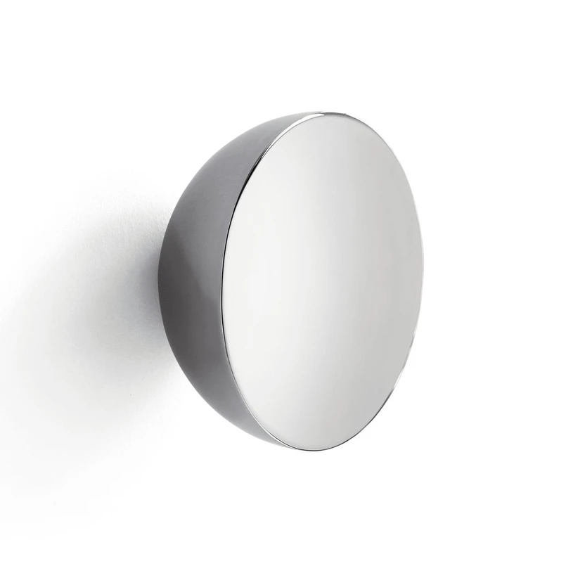 Den djärva materialiteten hos väggspegeln Aura skapar dess unika inre ljus – helt utan belysning. Tillverkad i polerat stål och utformad som en halvkula fångar den upp omgivningsljuset och skapar mångsidiga reflektioner genom kombinationen av hårda, plana ytor och långa kurvor. Dess vikt och styrka balanseras av den mjuka glansen och den skulpturalt svängda formen.