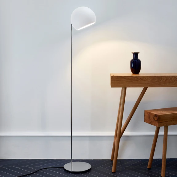Med sin behagliga höjd är golvlampan Tilt Globe Floor från Nyta den perfekta följeslagaren till favoritfåtöljen eller soffan, till exempel för att få tillräckligt med ljus för att läsa tidningen eller en bok på kvällen. Den passar dock lika bra som stilfull extra- och stämningsbelysning i moderna vardagsrum. Den har ett enkelt stativ i polerat stål som avslutas med en halvrund lampskärm i mattlackerat aluminium. Lampskärmen har en speciell egenskap: den kan vridas 360° så att ljuset kan riktas och spridas i önskad riktning.