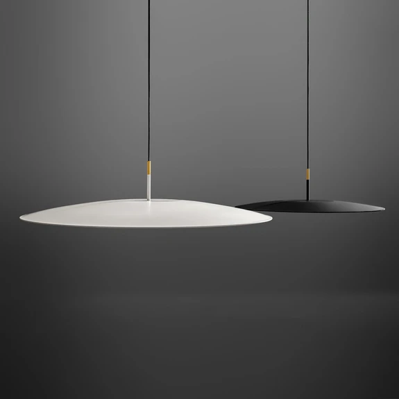 Overfly plus LED-pendellampa med bred metallskärm Overfly plus LED-pendellampa ger associationer till ett UFO tack vare den breda, runda och något konkava lampskärmen. Den fina, mycket sofistikerade designen kompletteras av fina räfflade mönster på kanten av ljuselementet, i mitten av den breda skärmen och i den övre delen av den styva upphängningen. Overfly plus är idealisk för belysning av bord, eftersom den avger sitt ljus direkt nedåt. Overfly-serien har formgivits av Marc Sadler, en internationellt verksam designer som var en av de första att ta examen från programmet "esthétique industrielle" vid ENSAD i Paris och som nu betraktas som en pionjär inom experimentell forskning om nya material för vardagsföremål och inredning. Han har redan designat lampor för många kända belysningstillverkare, som har hedrats med Compasso d'Oro flera gånger.