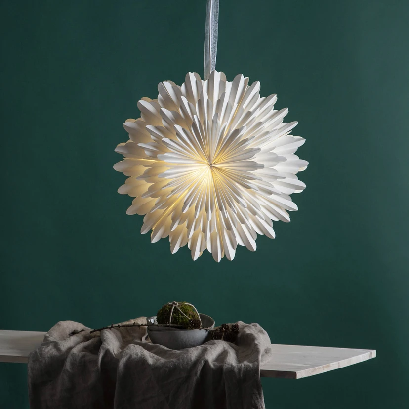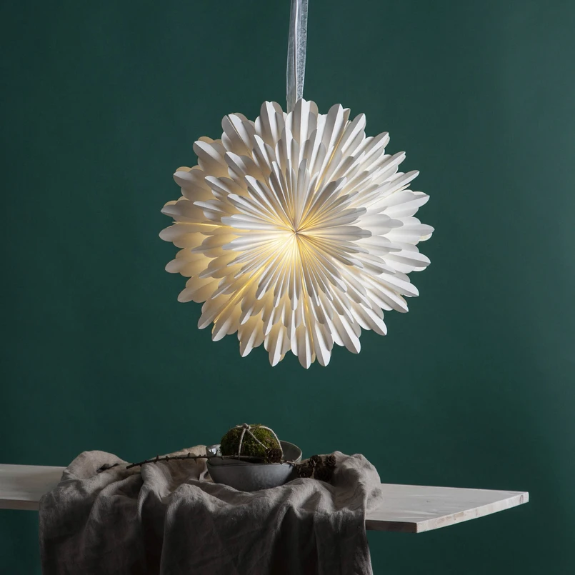 Den vita pappersstjärnan Snow är tillverkad av trefaldigt vikt papper och påminner i sin form om en snöflinga. Den passar perfekt som vägg- eller fönsterdekoration under vinter- och julen. Snow levereras utan fattning och sladd, men i leveransen ingår pappersstjärnan och ett stilfullt upphängningsband. För att kunna använda den med belysning kan man beställa ett lämpligt upphängningssystem med E14-uttag via tillbehören.