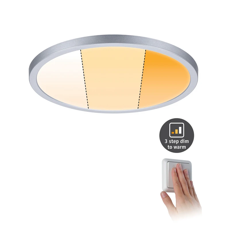 Dimm till varm - rund Areo infälld LED-panel Från funktionellt universalvitt till mysigt varmvitt kan denna Areo infällda panel dimmas och ljusfärgen ändras i tre steg utan extra utrustning. Denna funktion är särskilt lämplig om rummet är avsett som arbetsrum och samtidigt som en mysig tillflyktsort - sammanhängande utformade vardagsrum som en öppen planlösning för vardagsrum, kök och matplats är också idealiska användningsområden för panelen. Tack vare dim-to-warm-funktionen kan ljusfärg och ljusintensitet enkelt ändras genom att klicka flera gånger på den vanliga väggbrytaren, och VariFix-tekniken, som inkluderar två rörliga klämfjädrar på baksidan, gör att Areo kan sättas in i förborrade monteringshål av olika storlekar. Förutom vägg- och takmontering kan Areo LED-panel också användas i badrum och våtrum eftersom den är utrustad med IP44 stänkskydd - Ändra ljusfärg genom att trycka på väggbrytaren tre gånger: på - av (1-5 sekunder)- på - Tre utbytbara ljusfärger: 4.000 K (100%); 3.000 K (50%); 2.000 K (25%)