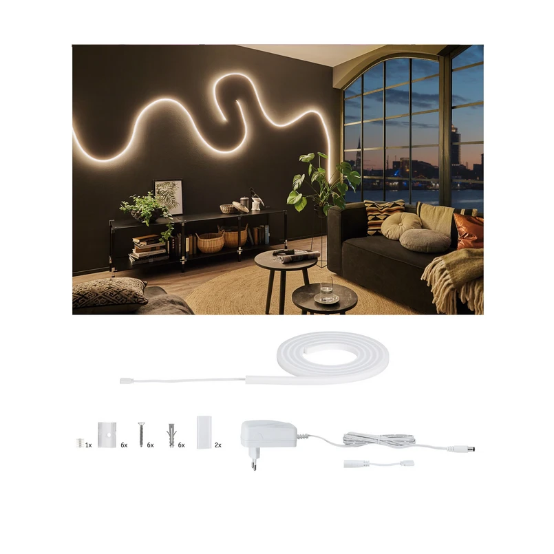 Unik ljusdesign med baspaketet MaxLED Flow Baspaketet MaxLED Flow ger ett brett ljus utan synliga LED-punkter. MaxLED Flow är utrustad med en flexibel profil och gjuten med stor spridningsvinkel. Den kan installeras i både raka och böjda linjer. Detta unika belysningselement är försett med IP67-skydd så att effektiv design även är möjlig i fuktrum och wellnessområden. Förutom lysröret och strömförsörjningen ingår även de knappt synliga, transparenta fästklämmorna, skruvarna och pluggarna - kan kortas ned efter behov