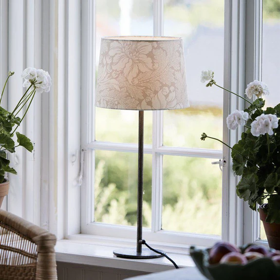 Bordslampan Base förenar stilren design med funktionell mångsidighet. Den smälter harmoniskt in i olika rumsinredningar. Kombinationen av vit skärm med blommönster ger lampan en tidlös elegans som sätter accenter både i vardagsrummet och i matsalen.