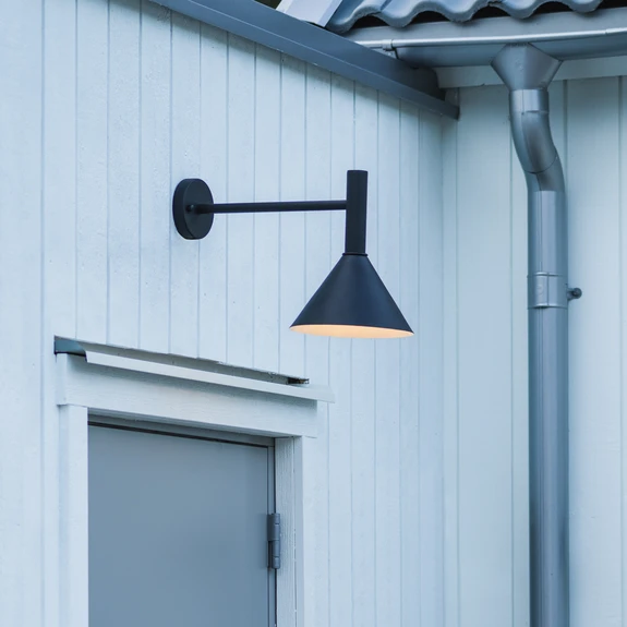 Tripp utomhusvägglampa med metallskärm Den moderna Tripp utomhusvägglampan i skandinavisk stil passar till många fasaddesigner och ger tillräcklig och säker belysning, t.ex. vid husets entré.