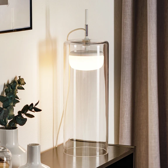 Diver LED-bordslampa av handblåst glas med metalldetaljer Diver LED-bordslampa har en intressant design med skärmar av handblåst glas. Den yttre cylindriska skärmen omger en inre opalvit skärm, som är nästan halvklotformad. Båda skärmarna är tillverkade av munblåst glas, där den inre skärmen skapar en jämn ljusspridning tack vare sin opalvita färg. Lackerade metallelement på toppen av den vita skärmen och som hållare skapar en effektfull kontrast. Diver LED bordslampa tillverkas av Prandina, ett belysningsföretag i Italien. Sergio Prandina grundade företaget 1982 och dess lampor är mycket igenkännliga tack vare sina skärmar, som huvudsakligen är tillverkade av handblåst glas. Armaturerna tillverkas i Italien och kännetecknas av högkvalitativa material, perfektion i form av handblåsta glasskärmar, kombination av olika ytor, mod att utveckla och ambitionen att visa ljuset i alla dess aspekter. Prandina arbetar med många kända designers och arkitekter. Belysningsserien Diver skapades till exempel av de belgiska formgivarna Serge och Robert Cornelissen. Serge Cornelissen BV, designstudion i Belgien, är specialiserad på design och utveckling av belysningskoncept och armaturer och designar armaturer för många välkända tillverkare. Serge Cornelissens design kännetecknas av en balanserad kombination av konstnärlig och teknisk kreativitet.