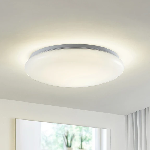 Enkel LED-taklampa Kisal med rörelsedetektor och IP44 LED-taklampan Kisal har ett diskret utseende. Den har en klassisk rund design och lampskärmen är tillverkad av slitstark plast i vitt. Det speciella med denna lampa är den integrerade rörelsedetektorn, som kan registrera rörelser inom en maximal räckvidd på 8 meter. Ljusets varaktighet kan justeras i steg. Med skyddsklass IP44 kan denna LED-taklampa även användas i fuktiga rum. Tekniska data: - Räckvidd max. 8 meter - Ljustid justerbar (5 s / 30 s / 1 min / 3 min / 5 min / 10 min / 20 min / 30 min) - Dagsljussensor (av eller 50 lux / 25 lux / 10 lux / 2 lux) - IP44