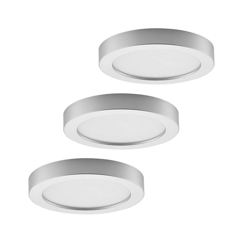 Edwina rund LED-taklampa med silverfärgad ram och kapslingsklass IP44, förinställbar färgtemperatur - i ett praktiskt set om 3 Denna taklampa med fast monterade LED-lampor är en klassisk allroundlampa för många tillfällen. Med hjälp av en DIP-omkopplare på armaturhuset kan du välja en av tre färgtemperaturer före installationen - beroende på vad som passar bäst för platsen och ändamålet. LED-lamporna ger ett starkt ljus med låg strömförbrukning och är därför särskilt effektiva. Vid behov kan ljusintensiteten justeras med hjälp av en extern dimmer. Kapslingsklassen IP44 ger dessutom ett bra skydd mot fukt, vilket innebär att Edwina även kan användas för att belysa fuktiga rum. LED-taklampan passar bra i både kommersiella och privata miljöer och den runda designen med silverfärgad ram är behagligt diskret och mångsidig. - förinställbar färgtemperatur (DIP-omkopplare) - kapslingsklass IP44 för badrum och fuktiga rum - externt dimbar - armaturen levereras i en uppsättning om 3