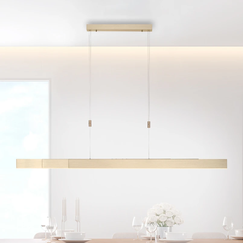 Pure Moto LED-pendellampa imponerar med sin moderna design och praktiska funktioner: Den kan snabbt och enkelt justeras i längd och upphängning. Dessutom är det möjligt att justera färgtemperaturen från varm till universalvitt och att dimma armaturen kontinuerligt. Belysningsförhållandena kan därför anpassas optimalt till respektive behov och platsförhållanden. Minnesfunktionen återgår till den senast valda ljusinställningen när pendelarmaturen slås på. Kontrollen sker via den medföljande fjärrkontrollen och den integrerade pekytan. Pure Moto är idealisk för att belysa vardagsrummet eller matbordet.