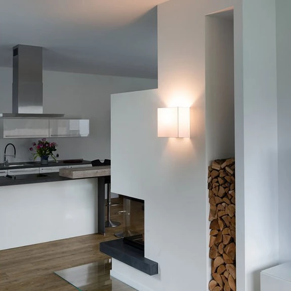 Kvadratisk Accanto vägglampa av textil Accanto vägglampa med textilskärm har ett behagligt och mysigt utseende. Den kantiga formen och den enhetliga färgen skapar ett enkelt helhetsintryck som kan integreras nästan var som helst. Skärmen är öppen upptill och nedtill, vilket gör att ljuset kan lysa upp väggen vertikalt och belysa rummet indirekt, samtidigt som det avges försiktigt framifrån genom textilen.