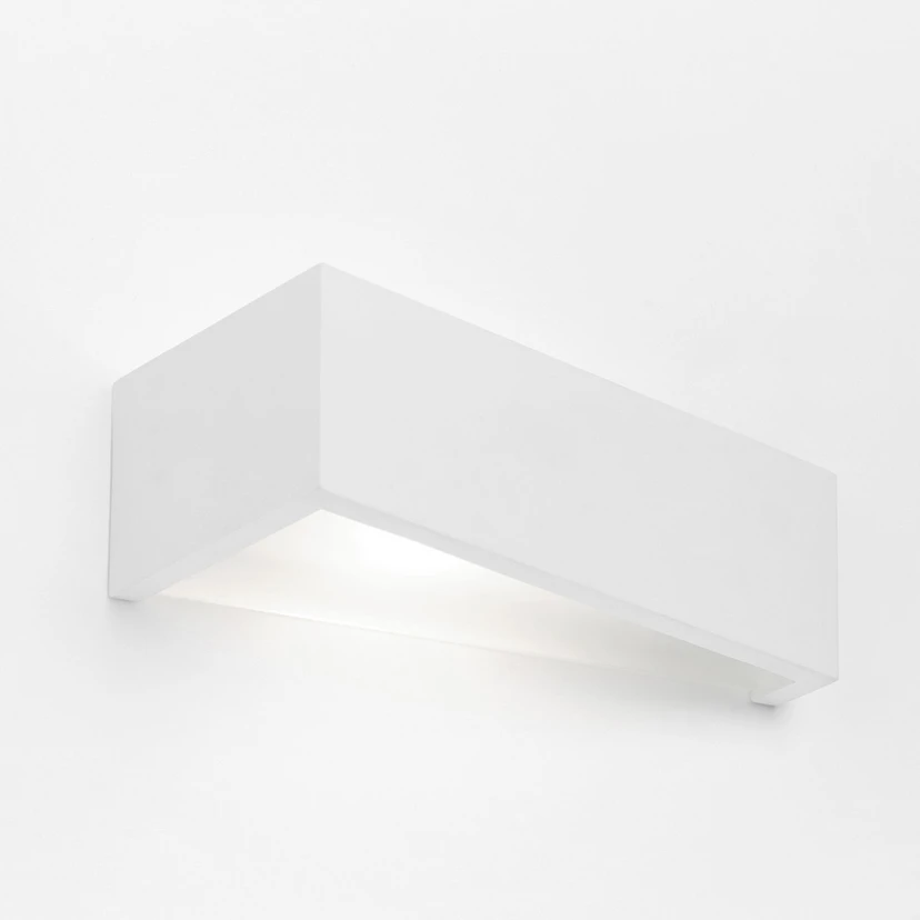 Indirekt lysande Teos vägglampa som vinklad rektangel Teos-lampan ser ut att vara nedsänkt i väggen. Designern Marco Spatti åstadkommer denna illusion med en rektangulär grundform vars kortsidor är olika långa och ger objektet en sned position. De använda G9-ljuskällorna är inte synliga från rummet och ger ett indirekt ljus. Vid behov kan vägglampan i gips målas i önskad färg för att skapa en harmonisk eller kontrasterande effekt.