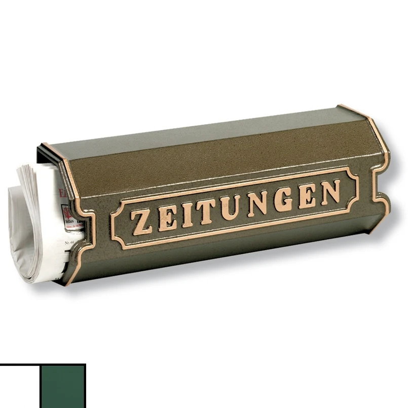 Tidningsbox i gjuten aluminium 1890 Denna tidningsbox i gjutjärn med extra stor öppning är det perfekta och praktiska komplementet till många brevlådor i gjuten aluminium. Tack vare sina generösa mått skyddar den pressprodukter av alla slag mot regn och vind, dygnet runt och alla tider på dygnet. Den iögonfallande men ändå enkla designen är ett blickfång på alla fasader. Det robusta materialet garanterar hållbarhet och dimensionsstabilitet. Kvalitet Tillverkad i Tyskland