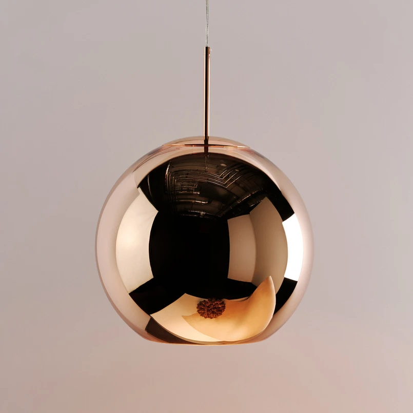 Lampskärmen på Copper Round LED-pendellampan fångar inte bara ögat på grund av sin nästan sfäriska utformning, utan framför allt på grund av den starkt reflekterande ytan, som kommer från ett tunt metallskikt som har applicerats på skärmen av polykarbonat med hjälp av vakuummetalliseringsprocessen. Denna process är också känd från tillverkningen av solglasögon och visiren i rymddräkter. Ytan får en starkt skimrande, varm glans. Ljuset från de inbyggda lysdioderna i ljusfärgen varmvitt ger en stämningsfull belysning, till exempel av ett bord.