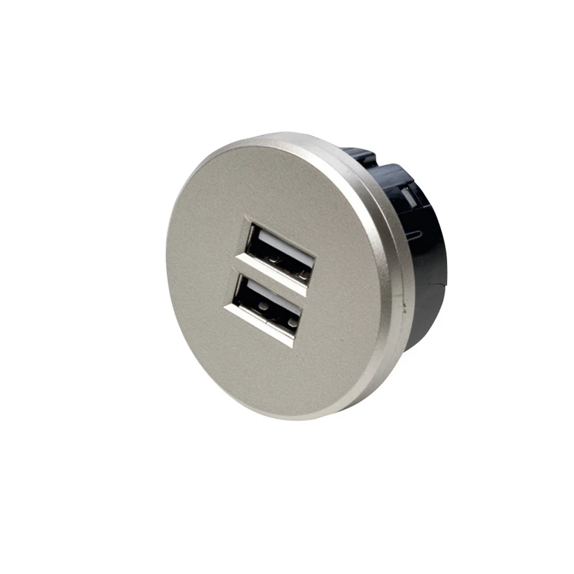 Runt inbyggnadsuttag med två USB-uttag, anslutning med Hera LED 24-kontakt Detta uttag med rund plastram är utformat för installation i möbler och paneler. Tack vare de två USB-uttagen kan du använda eller ladda två enheter som matas med 5 V - till exempel smartphones - Anslutningskabel 250 cm med Hera LED 24-kontakt - Kräver transformator med Hera LED 24-utgång och min. 15 W