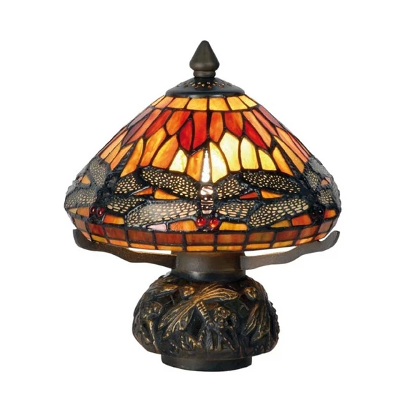 Libella - en bordslampa i tiffanystil med naturlig charmDenna bordslampa övertygar med en klassiskt designad exteriör som stilfullt kompletterar många rum. Glasskärmen i tiffanystil visar små trollsländor - ett motiv som också finns i basen. De varma gula och röda tonerna i glaset ger ett behagligt ljus och en harmonisk atmosfär i hela rummet.