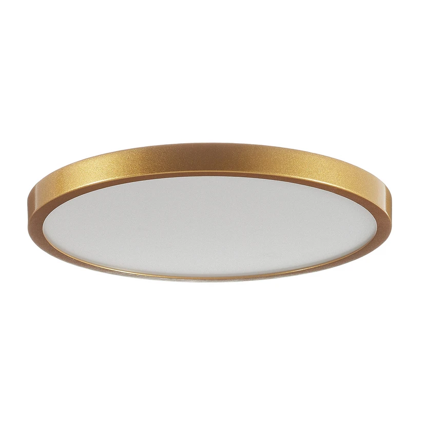 Vika - mattlackad LED-taklampa i guld LED-taklampan Vika imponerar först och främst med sin mycket platta design - den mäter bara 2,4 cm på höjden. Det är också en mycket flexibel ljuskälla, eftersom den kan användas i många olika rum och kombineras med många olika stilar. Det runda höljet är tillverkat av robust aluminium som lackerats i en matt guldton. Den vita satinplattan ger en bred ljusspridning som gör Vika idealisk för allmänbelysning i bostadsområden som hallar eller hobbyrum. Armaturen är lämplig för både tak- och väggmontering, vilket ytterligare understryker dess flexibilitet. Monteringsdelar och skruvar är inte synliga från utsidan!