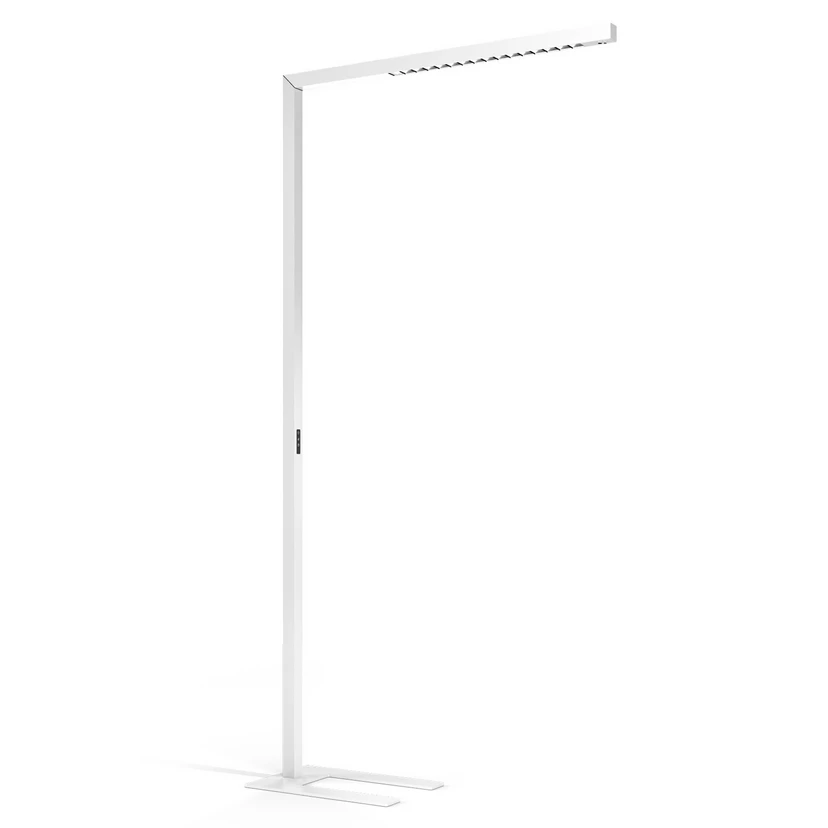 Beto LED-golvlampa för kontor med sensorsystem och kontrollpanel, direkt och indirekt ljus kan styras separat En smal, vinklad extruderad aluminiumprofil med vertikal ram och horisontellt huvud utgör stommen i Beto LED-golvlampan; en platt U-formad bas läggs till så att golvlampan kan placeras direkt på ett bord. Golvlampan är utformad för omgivande och arbetsbelysning i moderna kontor. Den har separata LED-ljuskällor för uppljus och nedljus, som kan styras separat. Uppåt ger en högkvalitativ linsoptik maximal och homogen takbelysning, medan det direkta arbetsljuset är asymmetriskt och bländfritt tack vare en förkromad reflektor med fasetterad optik. Manuell drift sker via touchpanelen på ramen, som används för omkoppling och dimning samt för konfigurering och aktivering av dagsljus- och närvarosensorn. Den senare möjliggör reglering till ett individuellt inställbart ljusstyrkevärde baserat på omgivningsljuset och automatisk till- och frånkoppling beroende på närvaro av människor - standardkonform avbländning för bildskärmsarbetsplatser: UGR ≤ 13 - med integrerad driftdon - IR-närvarosensorns detekteringsområde: Ø 4,5 m på golvet
