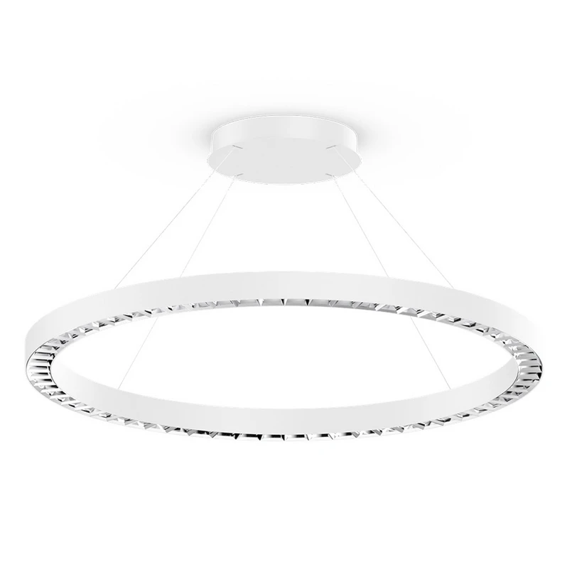 Ringformad LED-pendelarmatur Beto för kontor, DALI-dimbar, ljusfördelning nedåt I moderna kontors-, receptions- och mötesrum ger LED-pendelarmaturen Beto direktljus med stor yta och låg bländning. Utformningen som en ring av valsad och sömlöst svetsad extruderad aluminiumprofil med upphängning i fyra smala kablar är visuellt elegant. Ljuset från de kraftfulla LED-lamporna avges via en förkromad reflektor med fasettliknande utseende. Ljusflödet kan regleras externt och höjden kan justeras på armaturen utan verktyg. LED-konvertern är integrerad i den runda baldakinen (i samma färg som armaturen) - standardkonform avbländning för bildskärmsarbetsplatser: UGR ≤ 19 - med externt dimbar DALI-2-konverter - extruderad profil för förbättrad värmehantering